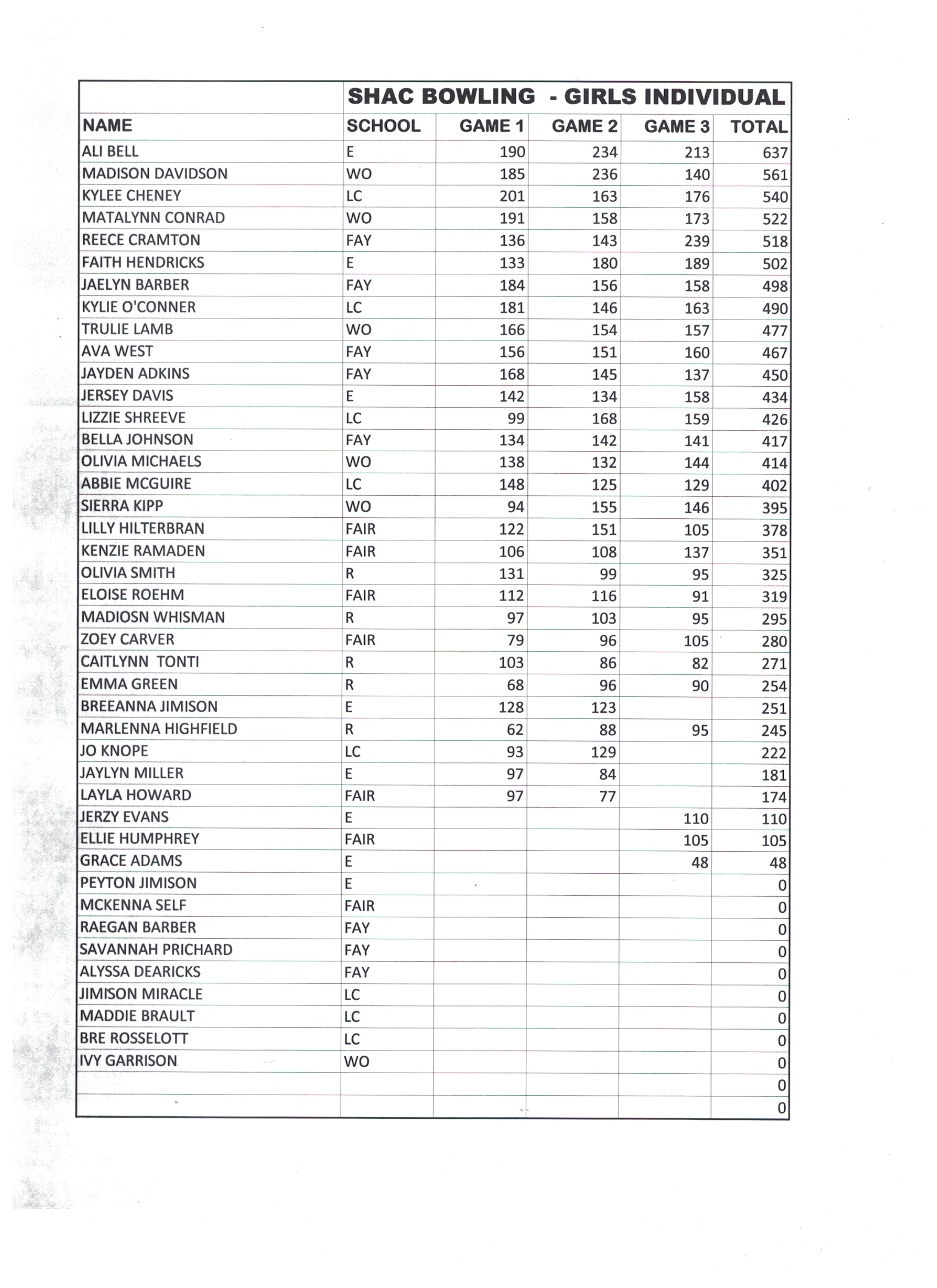 Bowling Tournament Results